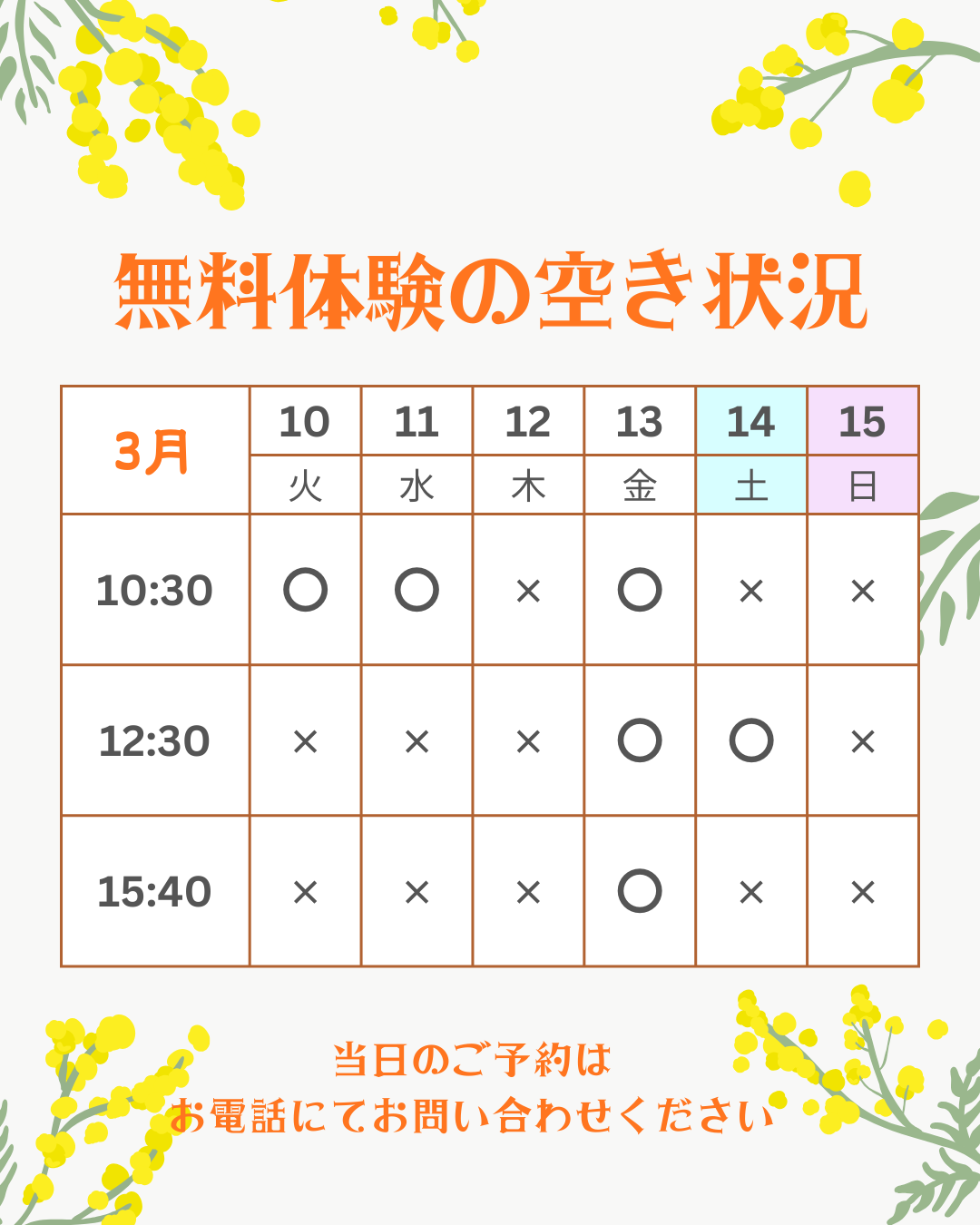 ※△または✖の場合や、その他の時間でも対応可能な場合がございます。