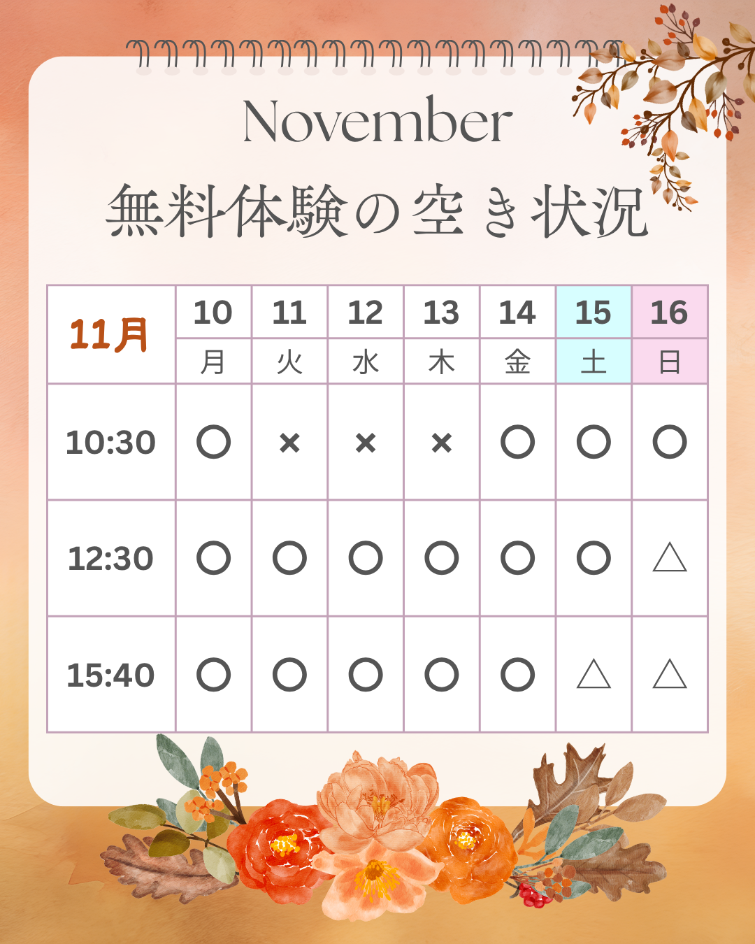 ※△または✖の場合や、その他の時間でも対応可能な場合がございます。